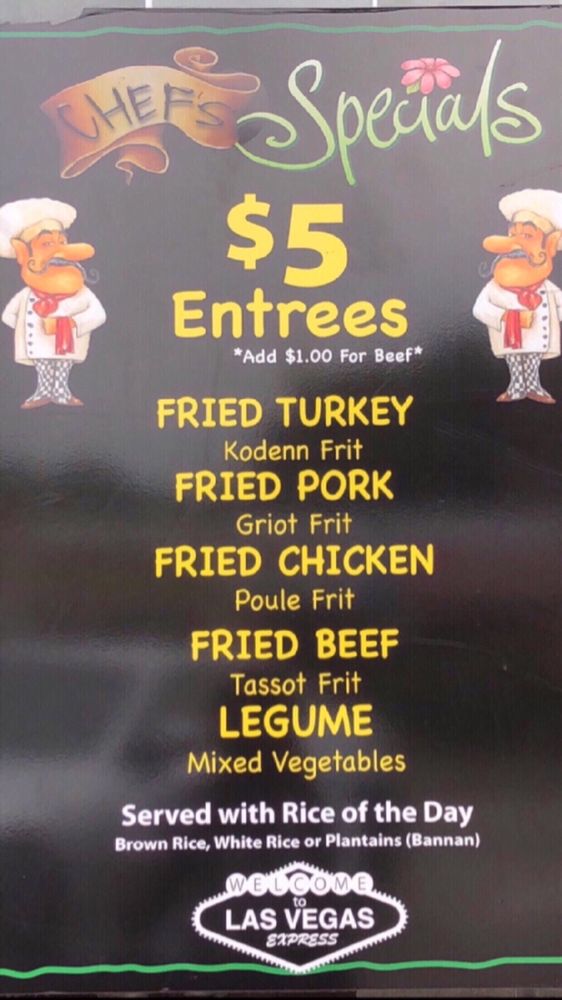 “ This is one of the two Las Vegas locations (both in the area) & I go to this one more often since parking is easier & staff is a little more friendly. They offer Haitian cuisine here & have a can't be beat deal of $5 for a plate! I usually get griot or turkey plate, which comes with rice & beans. One plate is good for two meals for me. Ordering can be done in person or over the phone. ”